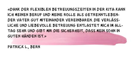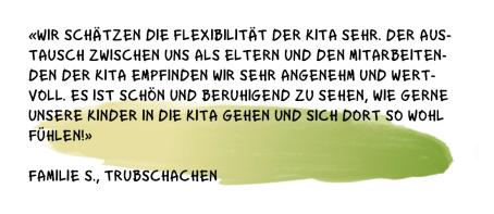 Wir schaffen ein Angebot, welches allen Familien eine familienergänzende Kinderbetreuung ermöglicht. Deshalb bieten wir flexible Betreuungsplätze an, haben längere Öffnungszeiten, welche auf den Schichtbetrieb abgestimmt sind, verzichten auf Betriebsferien, und betreuen auch Kinder, welche kränkeln. So wollen wir für Eltern eine verlässliche und unterstützende, sowie entlastende Dienstleistung anbieten.